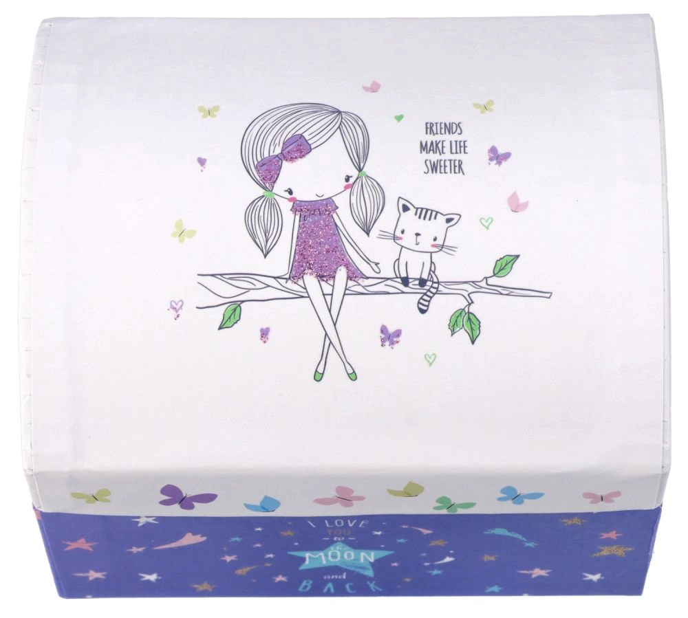 Отвътре ще откриете пространство с размери 12 x 6 x 6 cm, където могат да се съхраняват различни ценности или играчки. Общите размери на кутийката са 12,5 x 10 x 10 cm.
