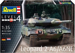 Реалистичен пластмасов модел LEOPARD 2A6/A6NL за опитни и начинаещи моделисти. Немски основен боен танк от 3-то поколение в детайлно изпълнение от Revell. Комплектът не включва бои и лепило; препоръчаните нюанси са посочени по-долу за постигане на автентичен вид.