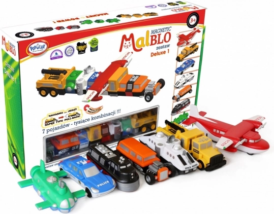 Конструкторът MalBlo MAGNETIC Deluxe е умна играчка за малки конструктори. 21 елемента в комплекта (7 готови превозни средства) позволяват да сглобите над 1000 различни комбинации – от коли и влекачи до самолети и машини на бъдещето. Елементите имат оптимална магнитна и механична сила на свързване, така че се управляват лесно и същевременно стоят стабилно.