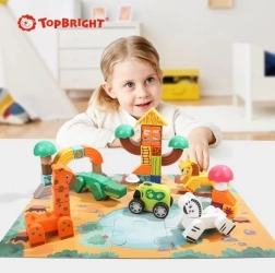 Пъстрите дървени кубчета позволяват сглобяване на офроуд превозно средство, сгради и сладки животни. Детайли като цветя и арка придават на играта уникален чар.