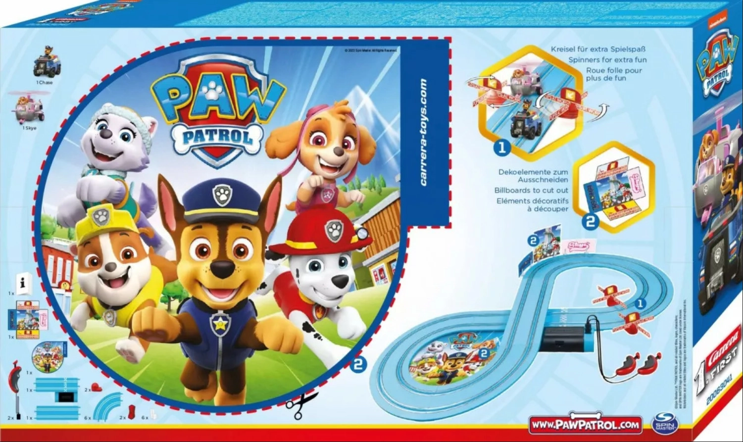 Забавна писта за най-малките с героите от сериала PAW PATROL предлага 2,4 m дълга трасe, два автомобила Chase и Skye, лесни батерийни контролери и игриви елементи, включително въртящи се перки. Идеален първи състезателен сет за деца от 3 години с качествена изработка CARRERA.