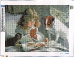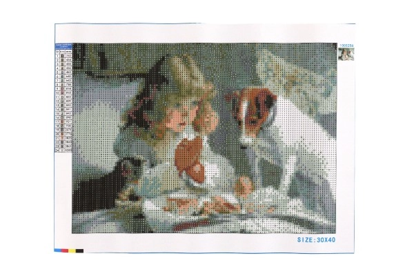 Детайлен мотив с момиче и кученце с размер 30 × 40 см, който след завършване блести красиво и изпъква в рамка във всеки интериор.