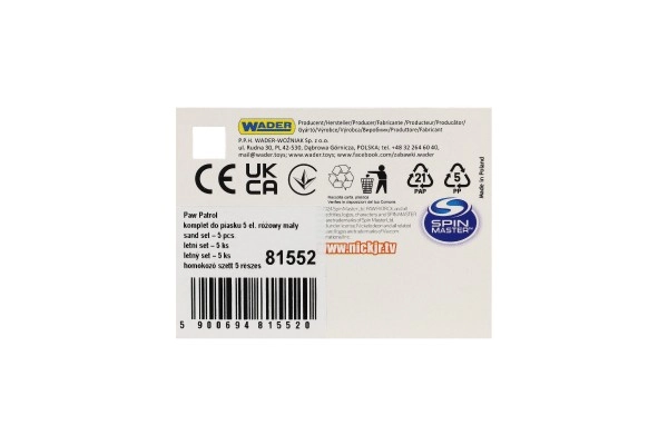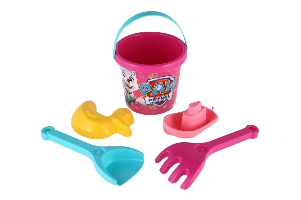 С розовия комплект за пясък PAW Patrol въображението няма граници. В опаковката ще намерите малка кофичка с обем 1 л, лопатка, гребло, лодка и формичка във формата на патенце – всичко в ярки цветове и с любими герои, които мотивират децата към творческа игра.