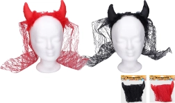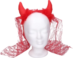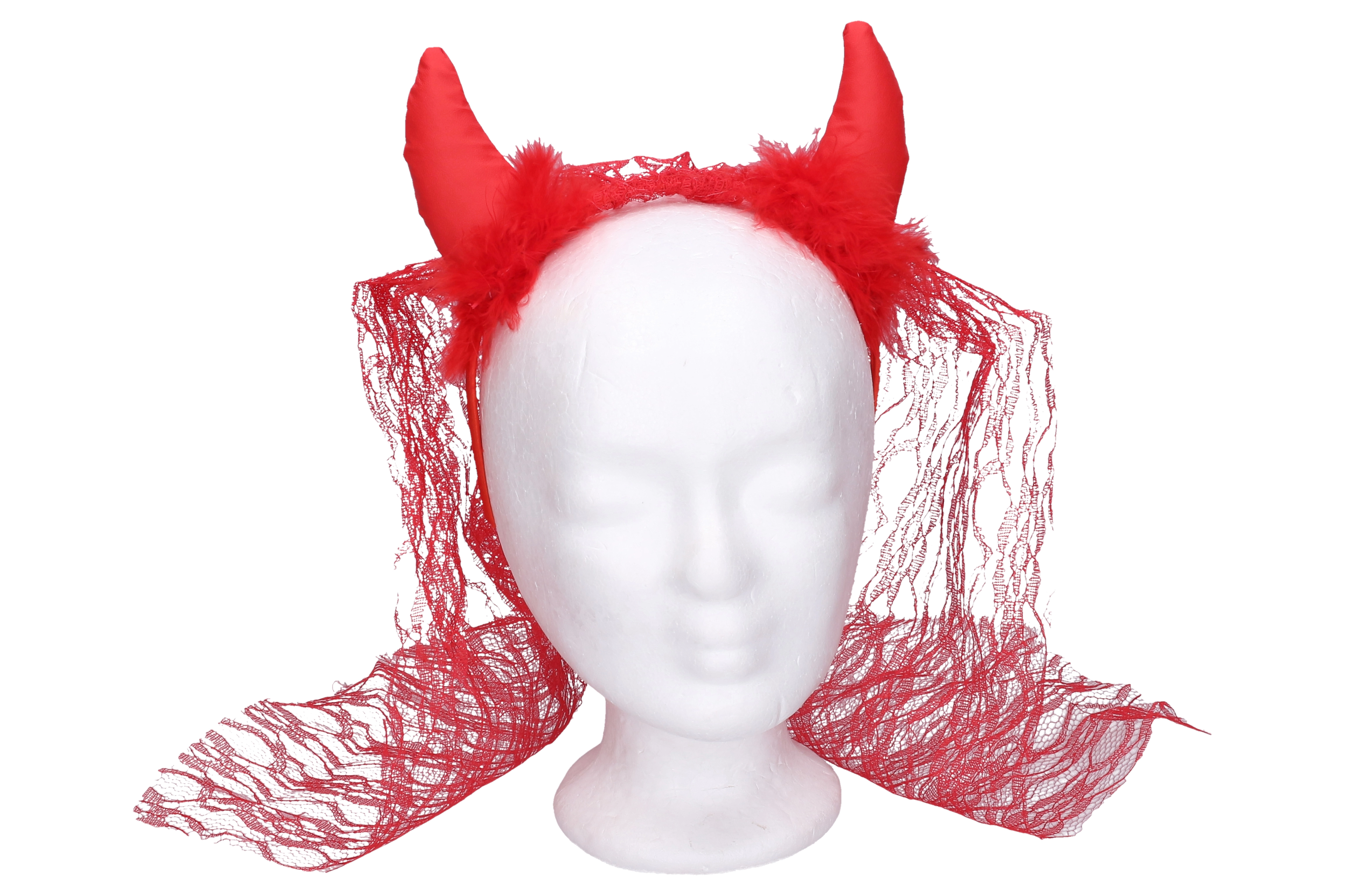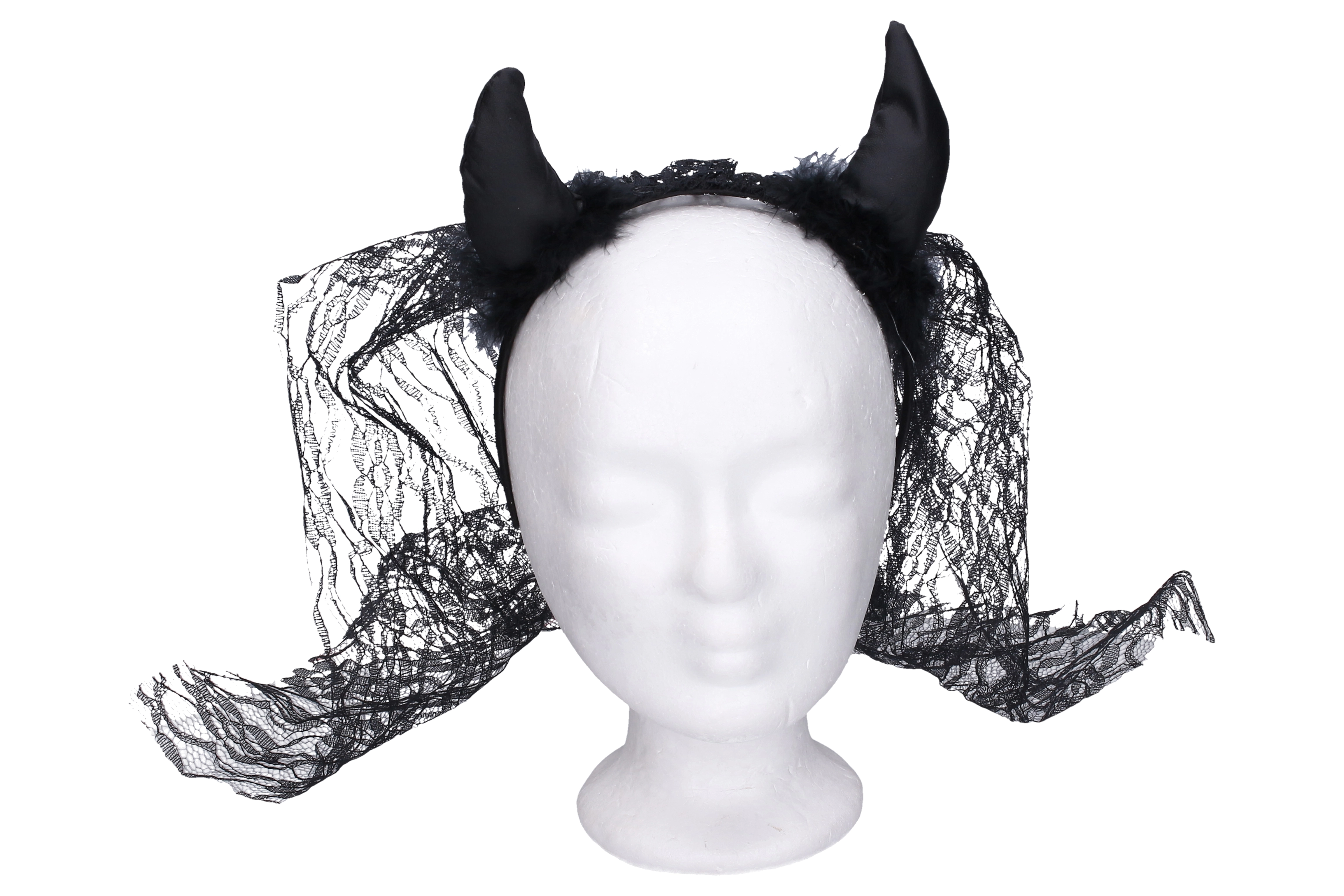Предупреждение: Не е играчка. Подходящо като костюмен аксесоар за възрастни. Съдържание на опаковката: 1× диадема с рога и воал.