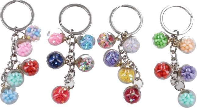 Добавете щипка стил към ежедневните си дреболии с ключодържател, украсен със стъклени топчета в различни цветове. Благодарение на прецизната изработка и устойчивия метален пръстен ключодържателят е не само ефектен, но и практичен – лесно се прикрепя към ключове, раница, чанта или телефон.