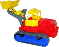 Този пластмасов верижен товарач е идеален за игра в пясъка и у дома. Благодарение на стабилните вериги се справя с неравен терен, а голямата кофа улеснява загребването на пясък или кубчета. Играчката е проектирана с внимание към безопасността на най-малките и издържа на интензивна употреба.