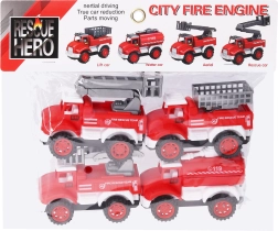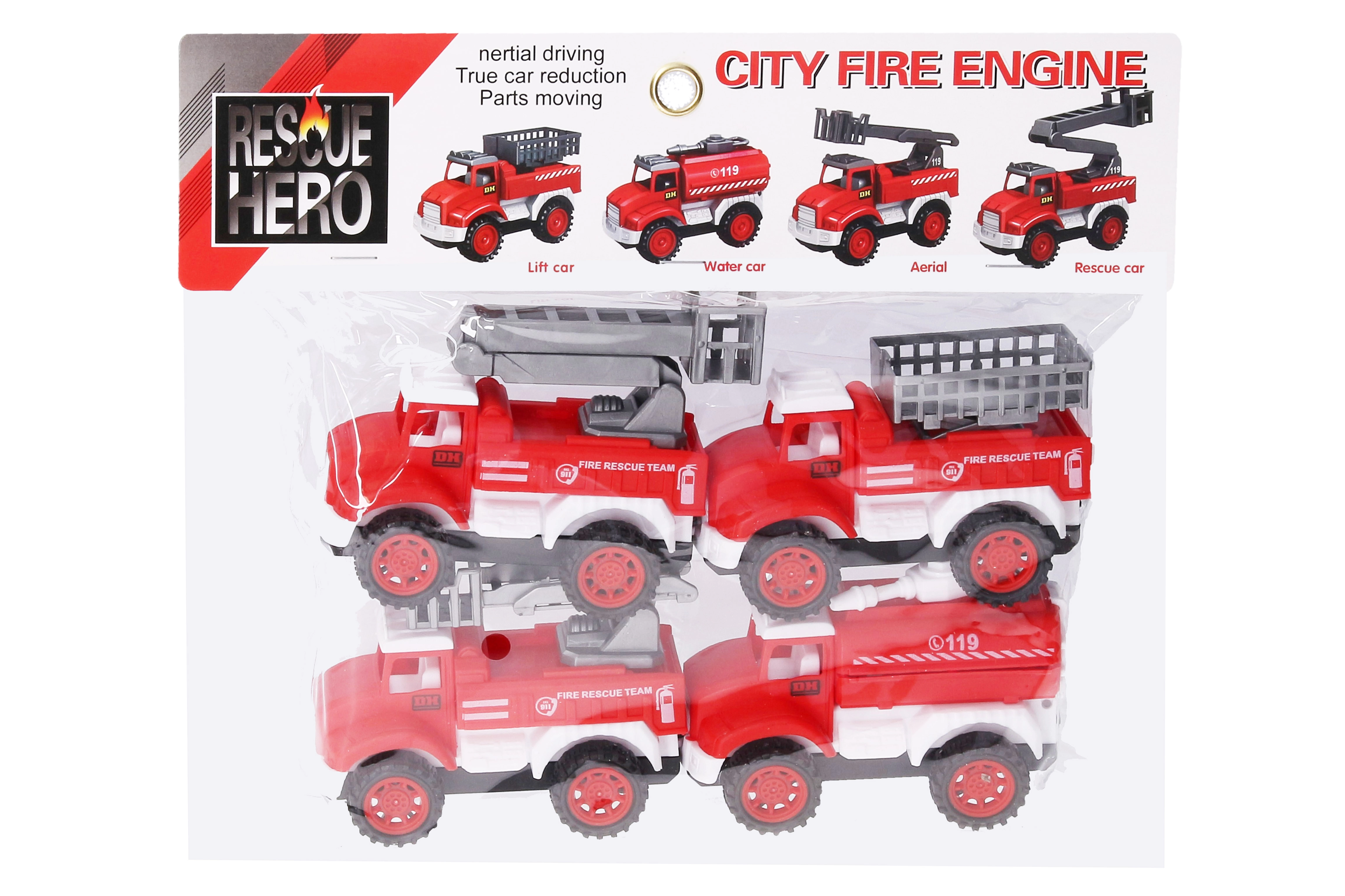 Този комплект съдържа четири червени пожарни колички с дължина 10,5 см, всяка представя различен тип пожарен автомобил: