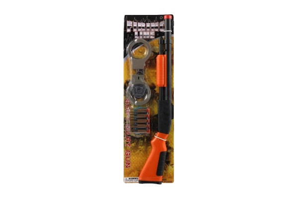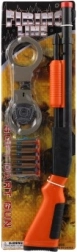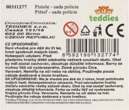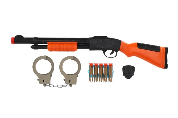 Комплектът съдържа всичко необходимо за игра на полицай, включително пушка, куршуми, белезници и значка.