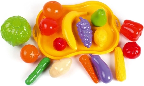 Пластмасовият комплект плодове и зеленчуци предлага чудесна възможност за децата да се научат да различават различни видове храни. Комплектът съдържа имитации на плодове и зеленчуци върху стабилен жълт поднос. Подпомага когнитивното развитие и помага на децата да разберат основите на здравословното хранене.