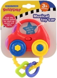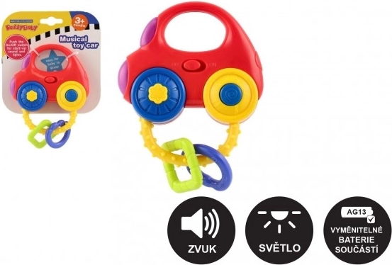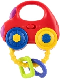 Пъстрата количка-дрънкалка носи на децата забавление и стимули за развитие на слуха, зрението и фината моторика. Достатъчно е да се разклати или да се натиснат бутоните и играчката ще засвети, ще пусне мелодии и реалистични звуци на запалване, движение и свирене. Компактните размери 10 × 11 см и заоблените форми улесняват хващането дори за най-малките.