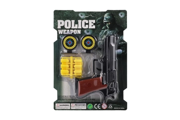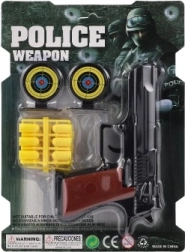 Пакетът съдържа всичко необходимо: 12 патрона за продължителна игра и 2 кръгли мишени за тренировка на точността. Компактният дизайн на пистолета стимулира въображението и ролята на малък полицай или спортен стрелец.