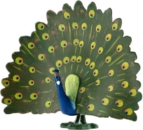 Тази реалистична пластмасова фигурка представя величествения индийски паун с подчертани цветове и характерна корона на главата. Благодарение на прецизните детайли ще оцените типичните „паунови очи“ по покривните пера и контраста между синьото тяло и зелените пера.