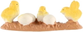 Декорацията включва три жълти пиленца и няколко бели яйца върху кафява поставка, което придава на дома ви весела атмосфера.