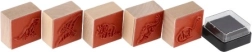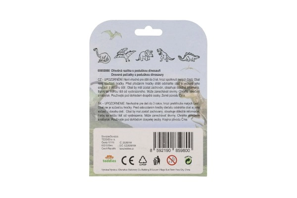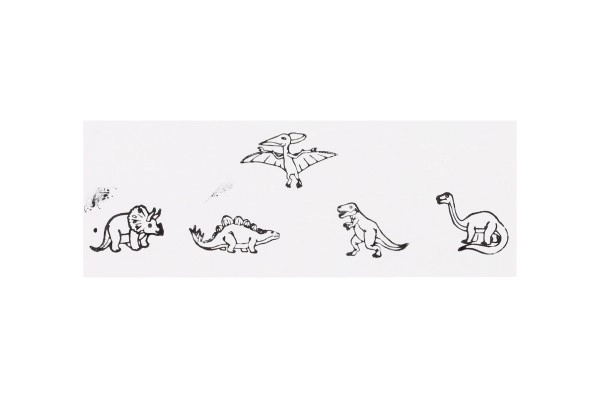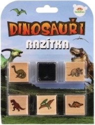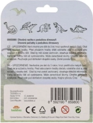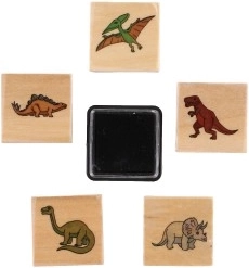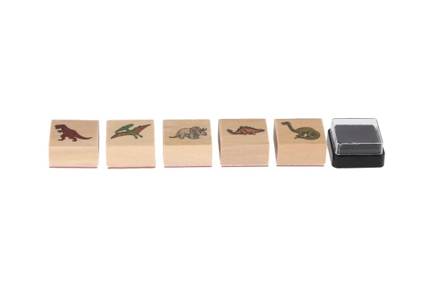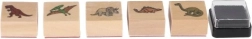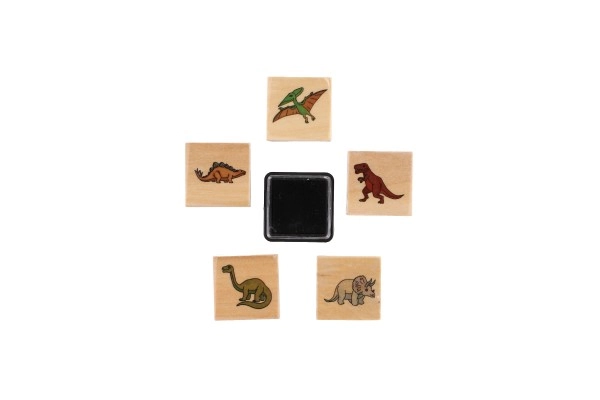 Пет дървени печата с мотиви на динозаври и мастилен тампон в комплекта – просто отворете и започнете да печатирате.