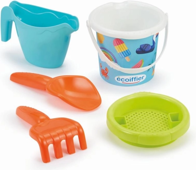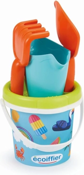 Детска кофичка с летен мотив и практични аксесоари за пясък: лейка, сито, гребло и лопатка.