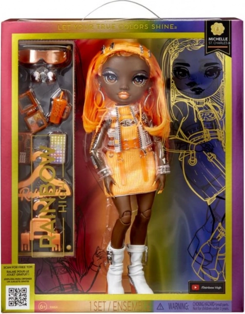 Открийте чара на модната кукла Rainbow High Michelle St. Charles, която впечатлява не само със своите живи оранжеви аксесоари, но и със стилното си облекло. Висока е приблизително 22 см и е идеална за деца от 6 години нагоре. Тази кукла не само развива въображението, но е и чудесен подарък благодарение на опаковката с размери 8.1 x 20.3 x 30.5 см.