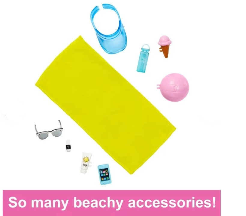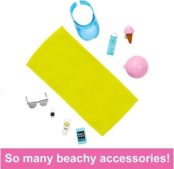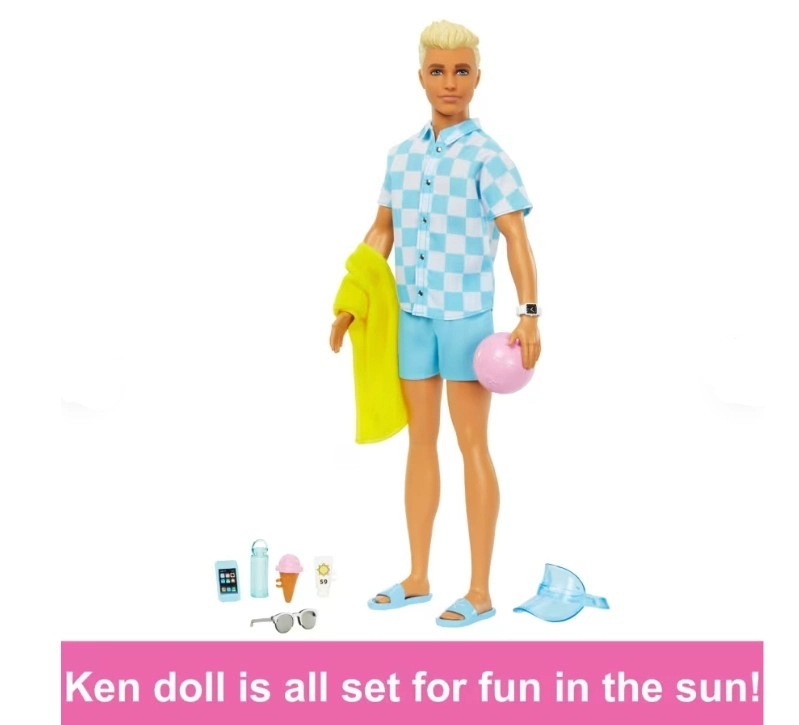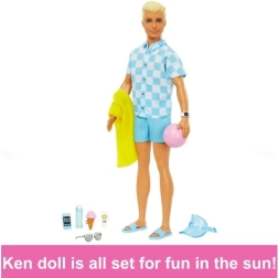 Кен е перфектният спътник за плажни приключения – от релакс върху хавлия до игри с плажна топка. Аксесоари като шапка с козирка, слънчеви очила или слънцезащитен крем насърчават креативната игра и развитието на социални умения.