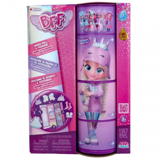 Открийте новите най-добри приятелки от серията Cry Babies BFF! Стилната кукла Stella има изразителни кристални очи, цветна коса и напълно подвижно тяло за пози. В комплекта ще намерите над 9 изненади, модерен тоалет, чанта и аксесоари – и уникален тубус-гардероб, който е част от играта. Идеален подарък за деца от 3 години.