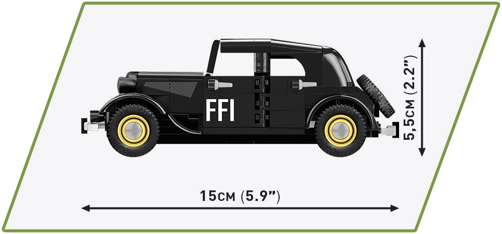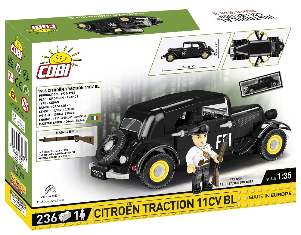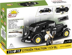 Сглобете парче история с детайлния конструктор на автомобил CITROËN Traction 11CV BL в мащаб 1:35 от COBI. Моделът с 236 елемента, отварящи се врати, въртящи се колела и висококачествени неизтриваеми принтове носи историческите отличителни знаци на FFI и включва фигурка на боец от френската съпротива.