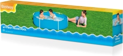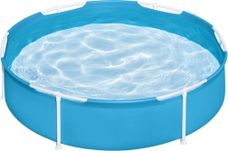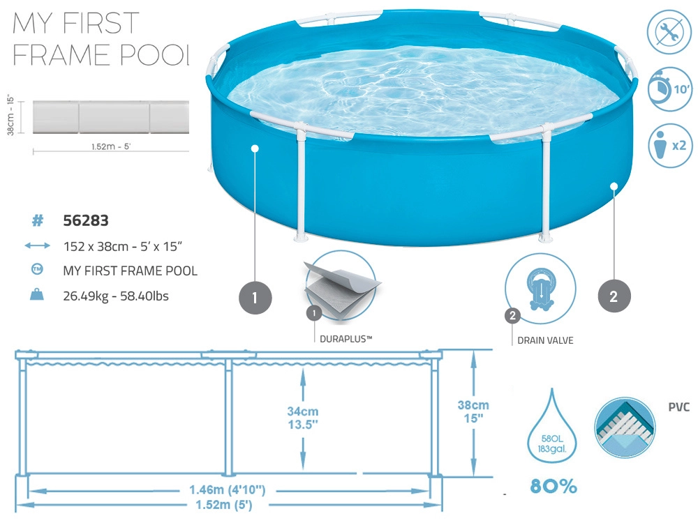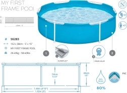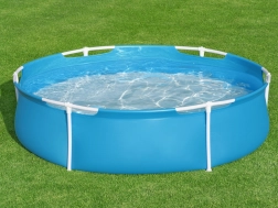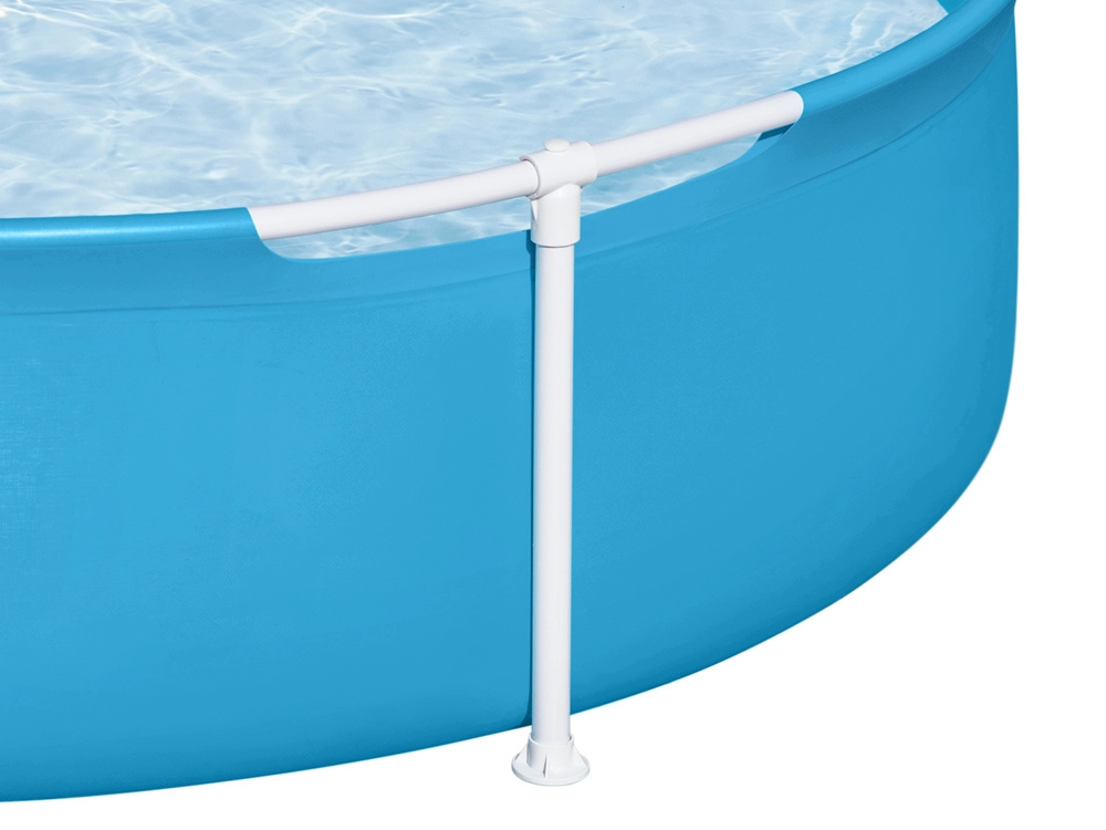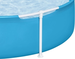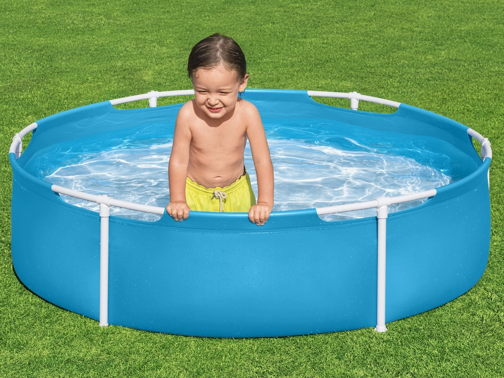 Басейнът е оборудван със стабилна, метална рамка, която осигурява подходяща здравина и дълготрайност на цялата конструкция. Стените са изработени от трислоен материал – комбинация от издръжлив полиестер и PVC, който предпазва от повреди.