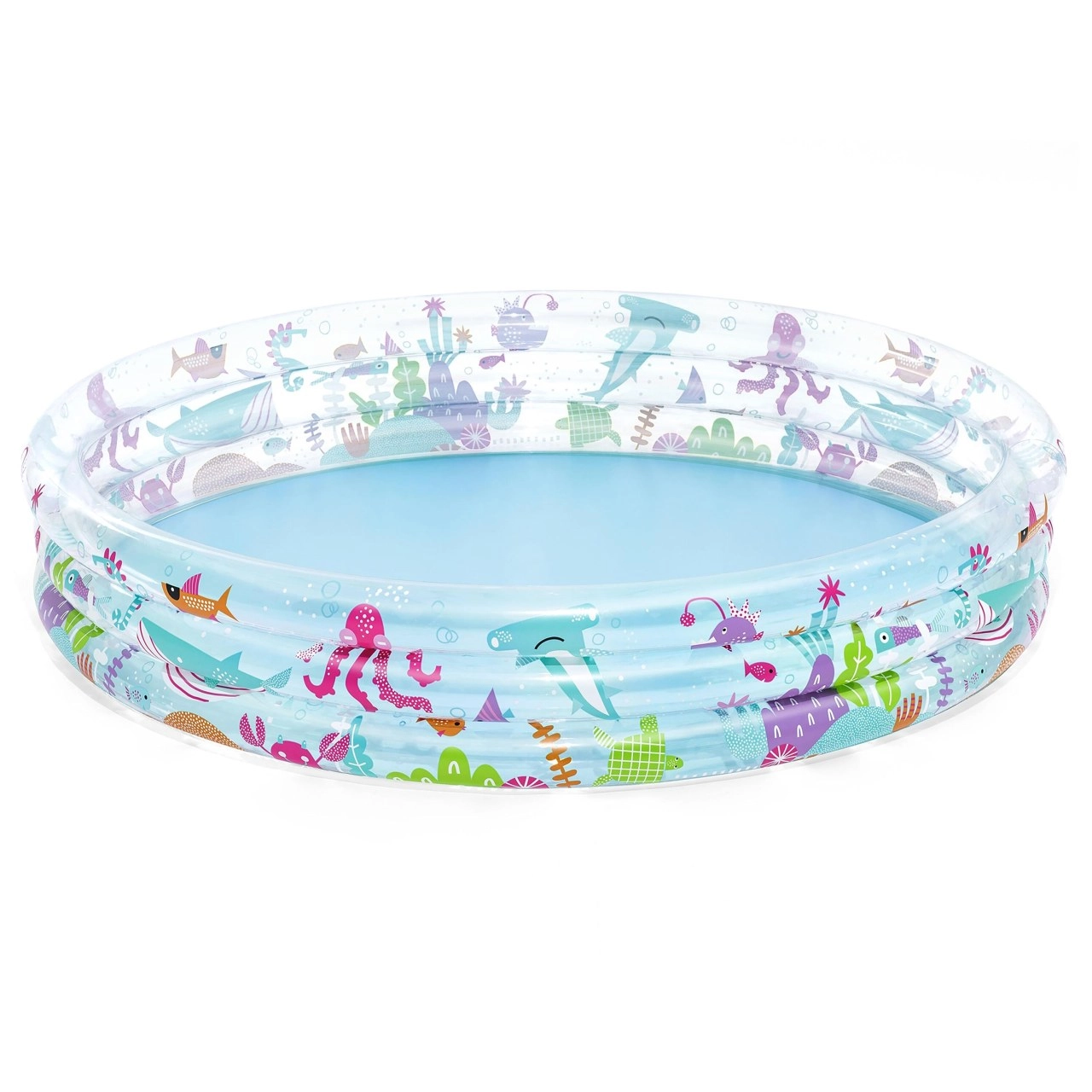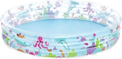 Надуваемият басейн BESTWAY Deep Dive е идеален избор за първите водни забавления на деца от 3 години. Качественият PVC материал и трите отделно надуваеми пръстена осигуряват стабилност, издръжливост и удобно използване. Пъстрият подводен дизайн с рибки и растения веднага привлича вниманието на децата.