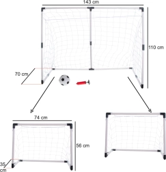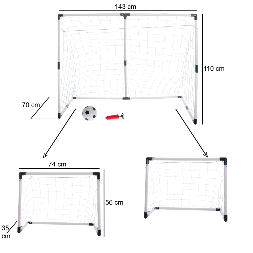 Тази футболна врата 2-в-1 е идеална за малки футболисти, които искат да изпробват уменията си както в игра, така и при тренировки за стрелба към вратата. Уникалният дизайн позволява да се сглоби една голяма врата с размери 143x110x70 см или да се раздели на две по-малки врати с размери 74x55x35 см.