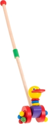 Весело дървено пате с пръчка, което децата могат да водят. Това е чудесна играчка за деца, които се учат да ходят, и мотивира към развитие на походката.