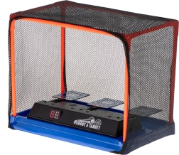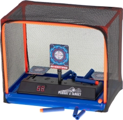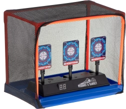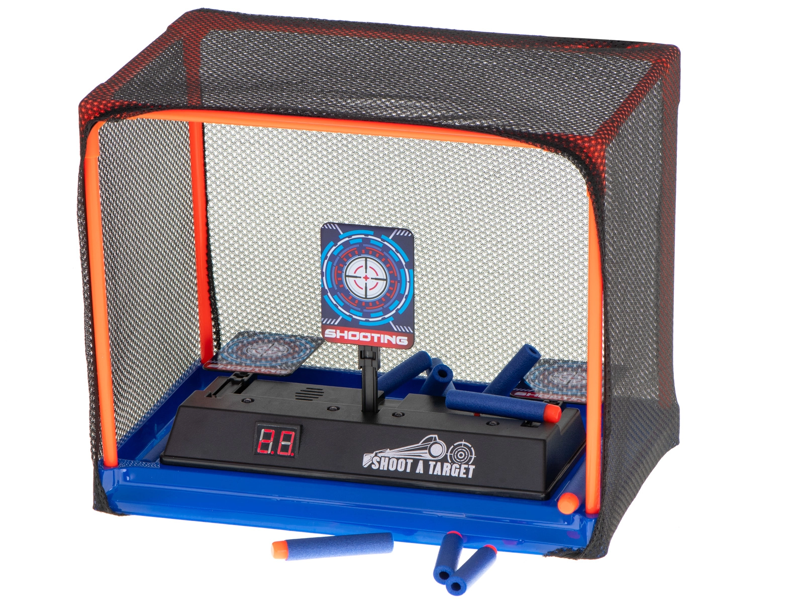 Подобрете своята точност и се насладете на часове забавление с електронна мишена с три цели, автоматично нулиране, дигитален брояч на точки и светлинни и звукови ефекти. Сигурната мрежеста клетка улавя пянастрели и улеснява почистването.