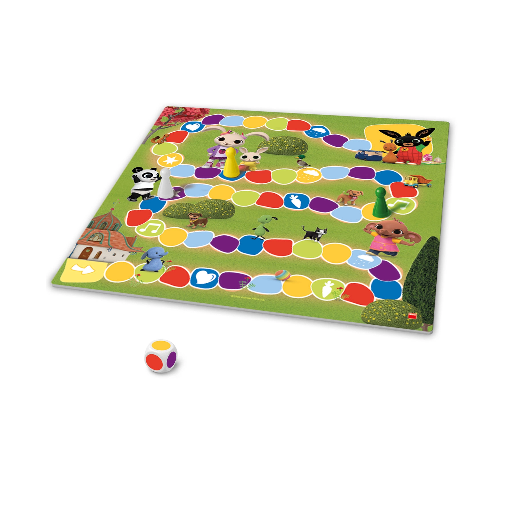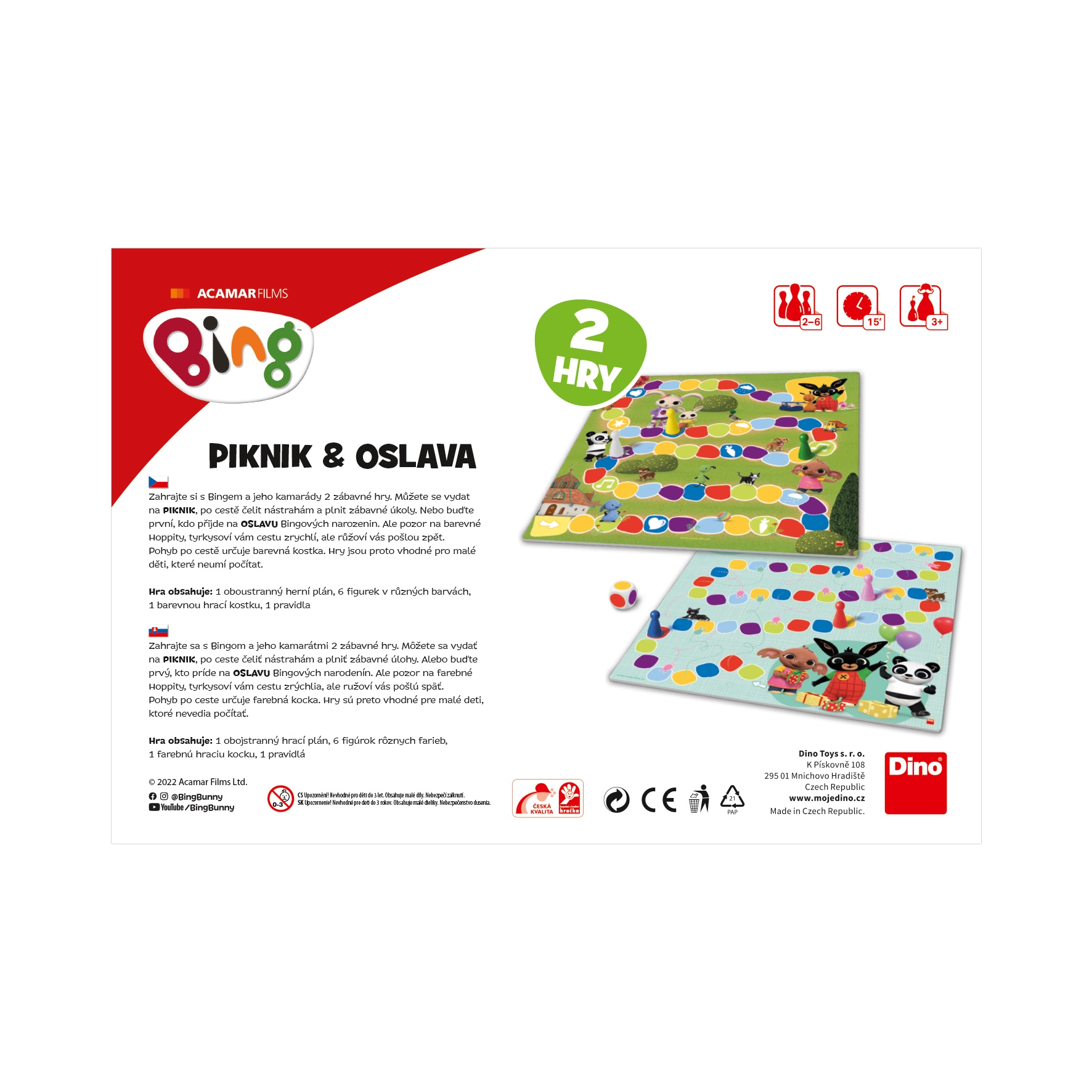 Влезте в света на BING и неговите приятели с комплект от две настолни игри в едно. Ще тръгнете ли на пикник, пълен с задачи и изненади, или ще станете първият, който ще стигне до рожденото парти? Цветното зарче определя движението по трасето, така че играта е подходяща и за деца, които още не могат да броят. Специални полета с цветни Hoppity ускоряват пътя или ви връщат назад – напрежението е гарантирано!