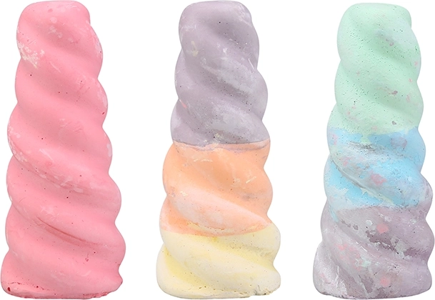 Цветен комплект от три тебешира във форма на рог на еднорог ще зарадва както деца, така и възрастни. Идеални за рисуване на тротоар и дъска, лесни за държане и осигуряват ярки цветове и гладък щрих.