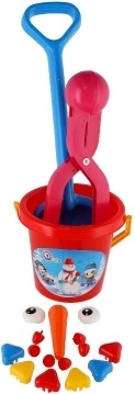 Всичко необходимо за лесно и забавно строене на снежен човек – кофа, лопатка и форми.