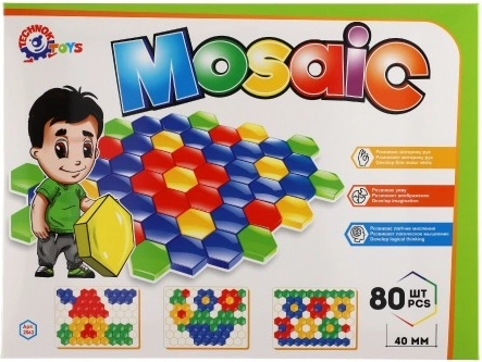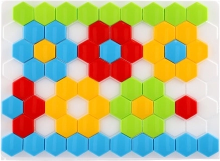Тази завладяваща мозайка предлага на децата безкрайни възможности за създаване на разнообразни картинки и мотиви. Цветните шестоъгълници се подреждат върху подложка, наподобяваща пчелна пита, което стимулира креативното мислене. Играчката е не само забавна, но и подпомага развитието на фината моторика и пространственото възприятие.