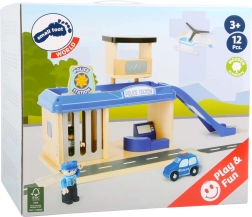 Реалистичната полицейска станция small foot стимулира детското въображение и развива фината моторика. Двата етажа, кулата с хелипад, функционалната килия с изтегляща се решетка и рампата за паркиране създават добре организирана игрова среда. В комплекта са включени полицейска кола, хеликоптер и две подвижни фигурки – полицай и престъпник – за безкрайни сценарии на игра.