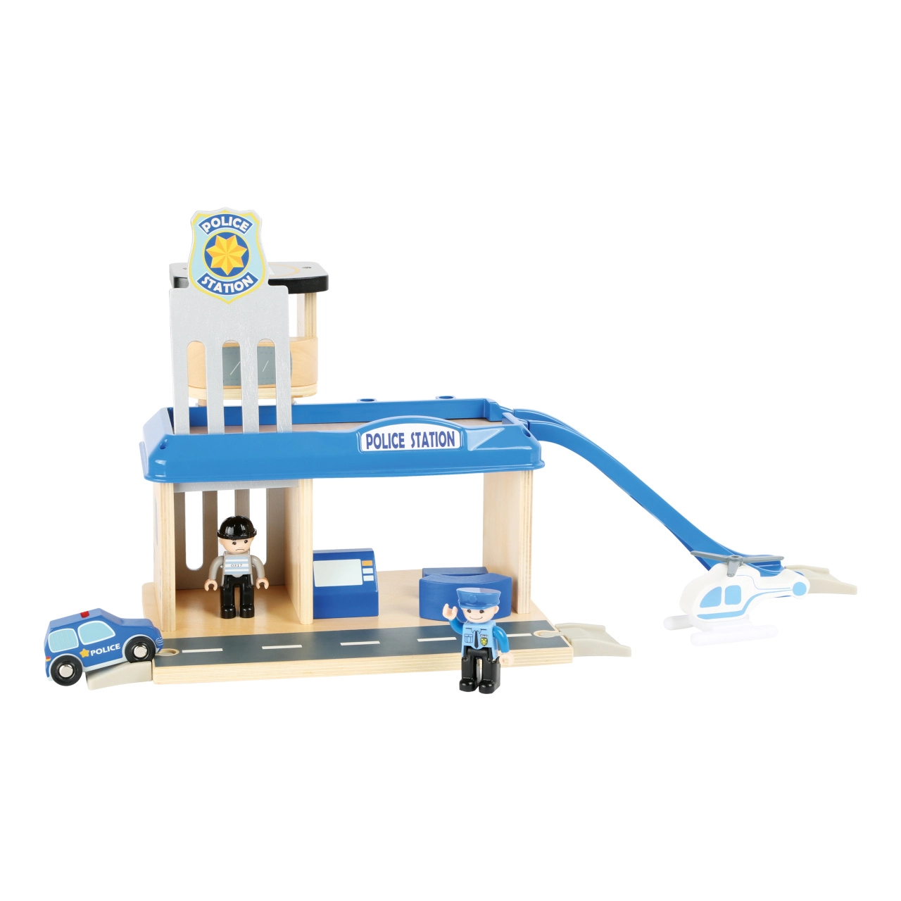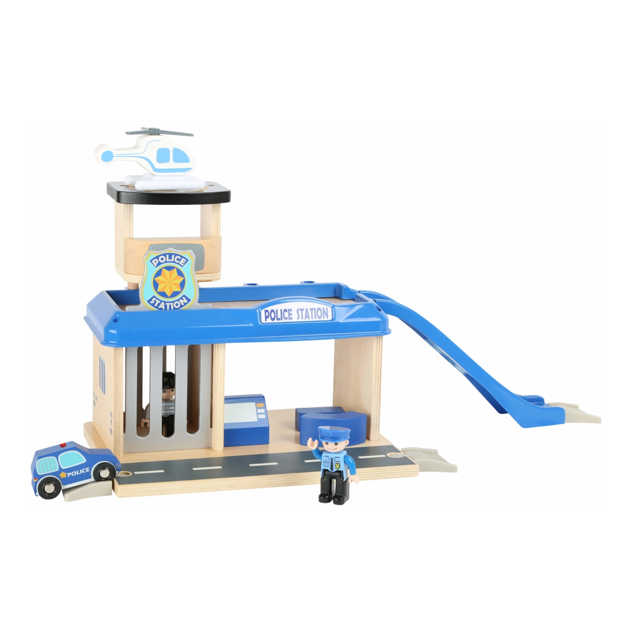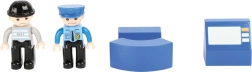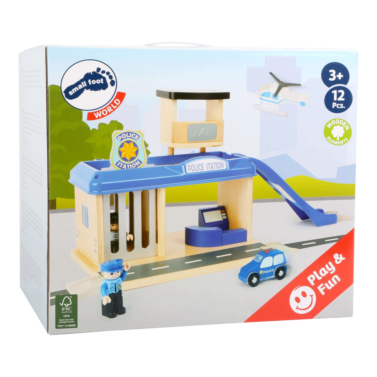 Подарете на децата свят от екшън истории с тази полицейска станция small foot от 100% FSC® дърво. Двуетажната станция с кула и хелипад, килия с изтегляща се решетка и рампа за изкачване идва с богато оборудване: полицейска кола, хеликоптер и две фигурки. Здравата комбинация от дърво и висококачествен пластмасов материал гарантира издръжливост и дълъг живот, а сетът е съвместим с жп трасета на други производители.