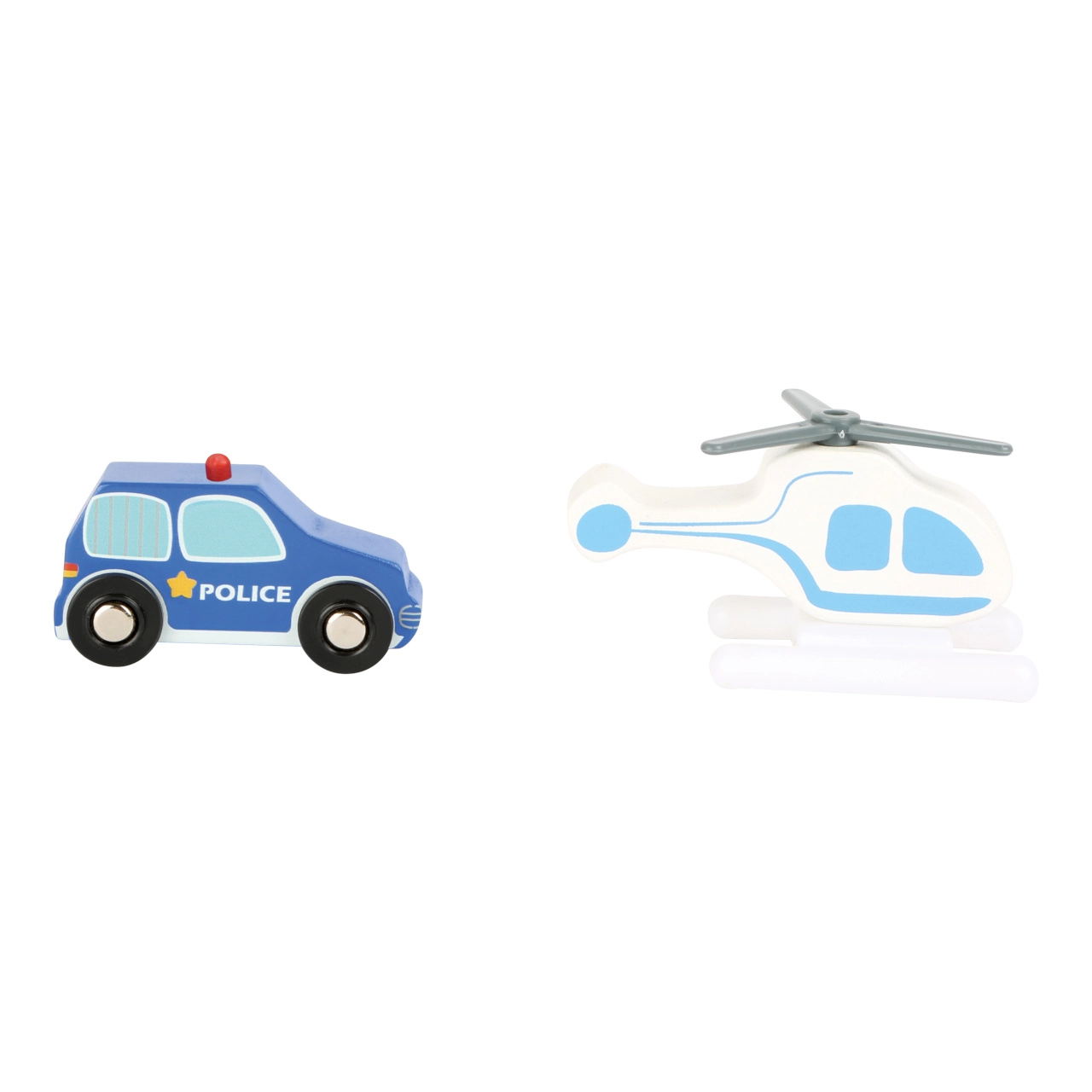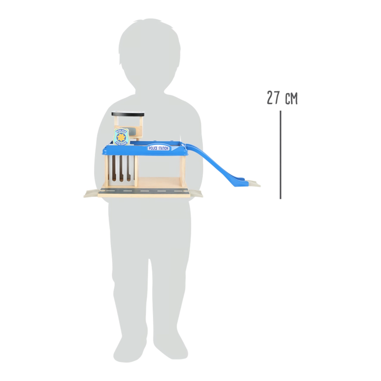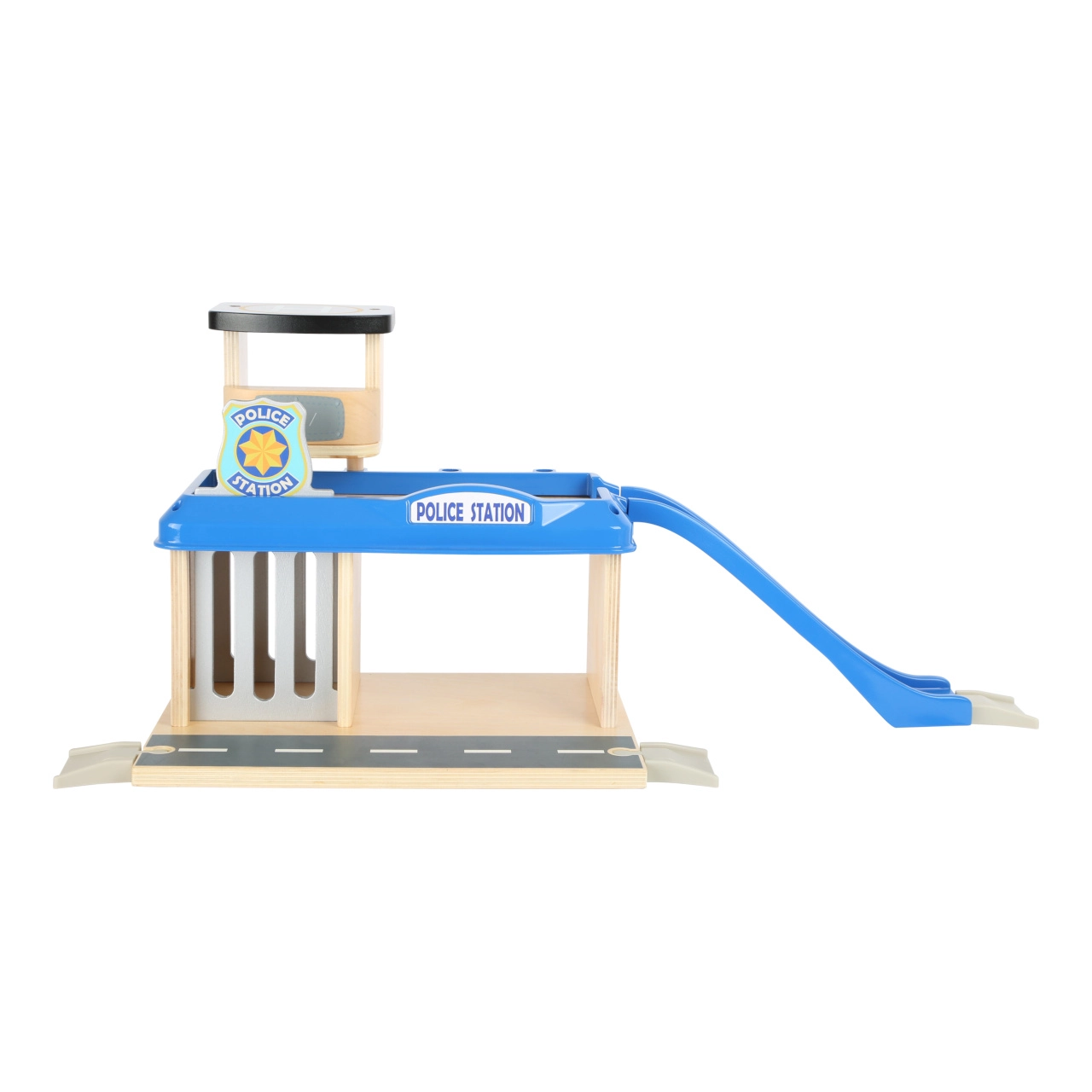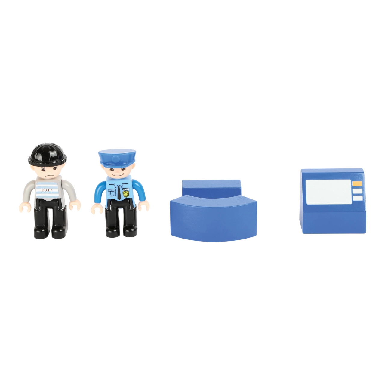 Подарете на децата свят от екшън истории с тази полицейска станция small foot от 100% FSC® дърво. Двуетажната станция с кула и хелипад, килия с изтегляща се решетка и рампа за изкачване идва с богато оборудване: полицейска кола, хеликоптер и две фигурки. Здравата комбинация от дърво и висококачествен пластмасов материал гарантира издръжливост и дълъг живот, а сетът е съвместим с жп трасета на други производители.