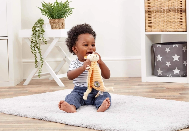 Благодарение на плоското „одеялно“ телце се хваща лесно и от най-малките ръчички, а леката изработка е чудесна за креватче, количка и пътуване. Практичното пране на ръка улеснява поддръжката и удължава живота на любимата играчка.