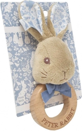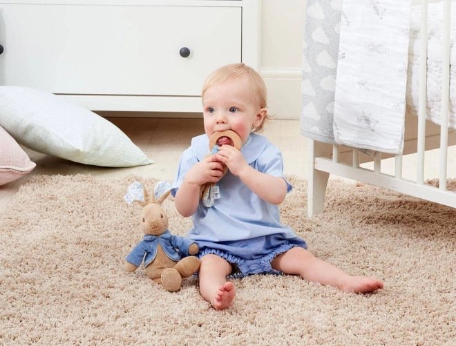 Тази стилна дрънкалка и гризалка с Питър Рабит подкрепя ранното развитие на бебето чрез сензорна стимулация. Съчетава мек, приятен плюш от 100% памук и здрав дървен пръстен от устойчиви източници, който се държи удобно и от малки бебешки ръчички.