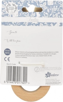 Гладкият дървен пръстен с естествени антибактериални свойства облекчава при никненето на зъбки и е щадящ към бебешките венци.