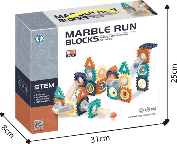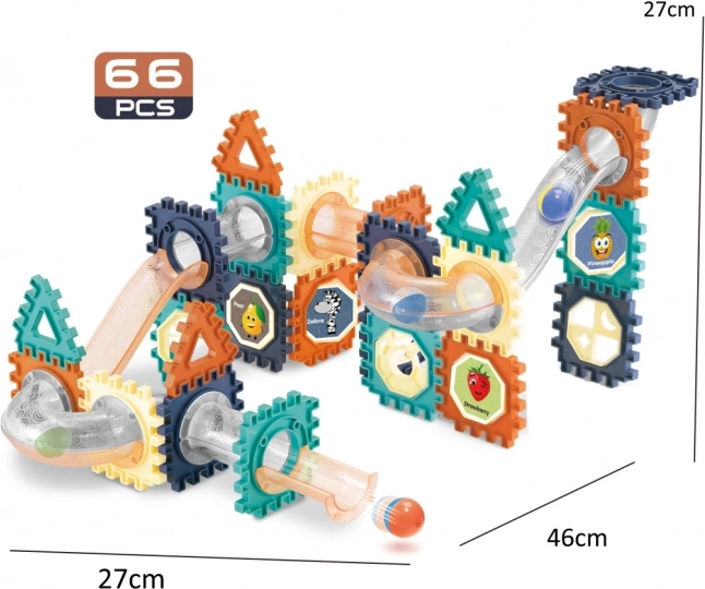 Строителният комплект за топчеста писта с 66 части предлага пространство за фантазия и технически умения. Сглобявайте оригинални трасета с различни завои, наклони и препятствия, изграждайте тунели и мостове или създайте цяло малко градче. Всяко ново сглобяване носи различно изживяване и насърчава децата да експериментират.
