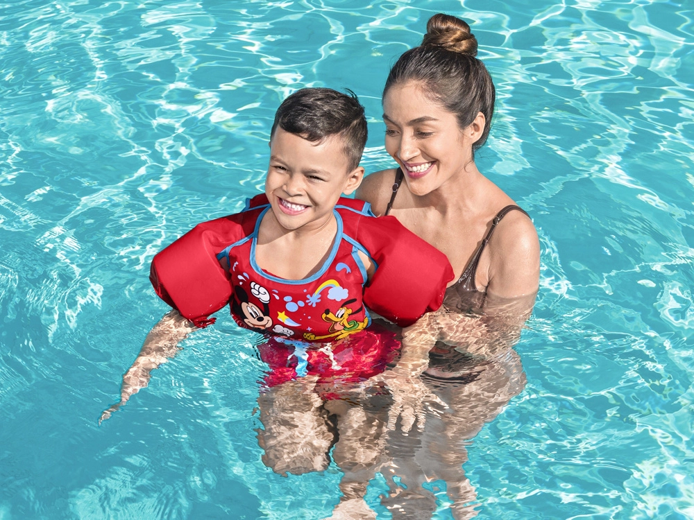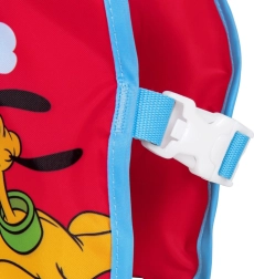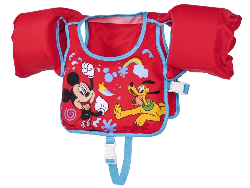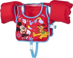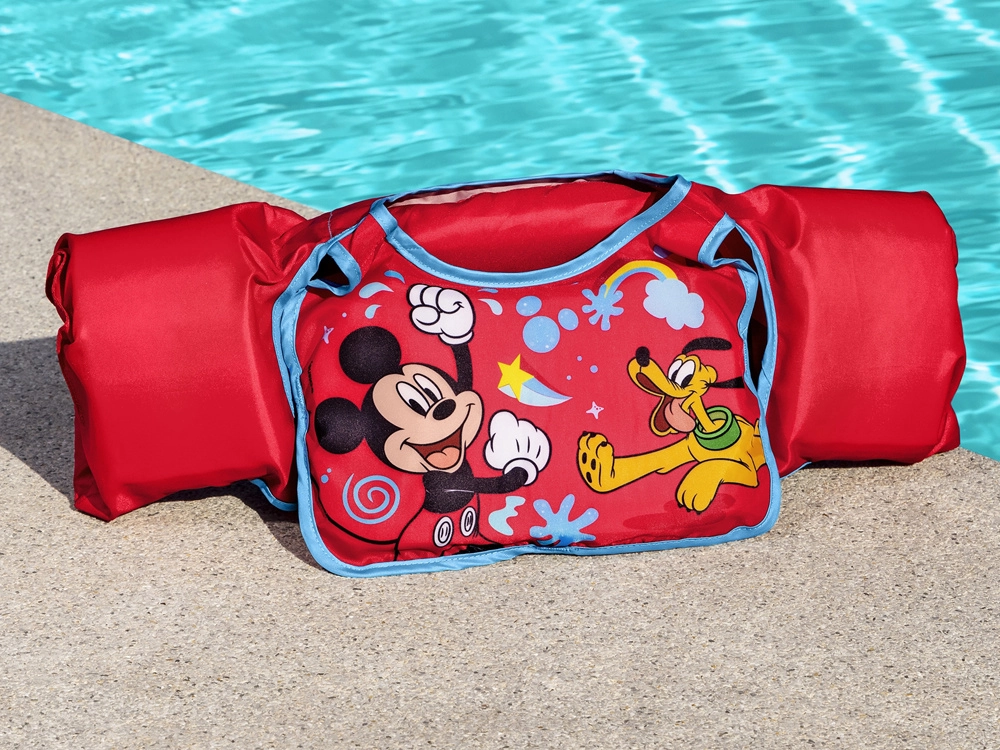 Текстилният, бързосъхнещ материал е приятен на допир и, за разлика от гумата, не залепва за кожата. Веселият мотив Mickey Mouse и Pluto мотивира децата към игри и обучение по плуване, а яркочервеният цвят повишава видимостта във водата. Препоръчителната обиколка на гръдния кош е 56 см. Жилетката е предназначена за употреба само във вода и под наблюдение на възрастен.