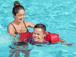 Пяната във вътрешността в комбинация с ръкавките и гръдния панел подпомага стабилността във водата и дава увереност на децата при усвояване на плувните умения.
