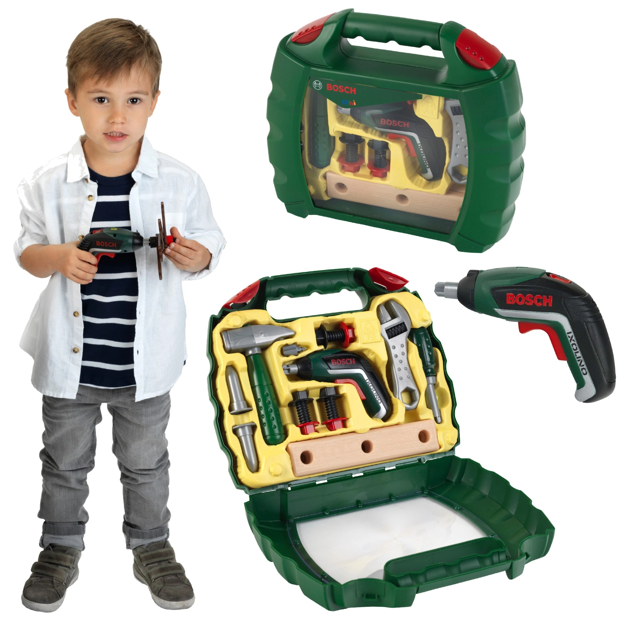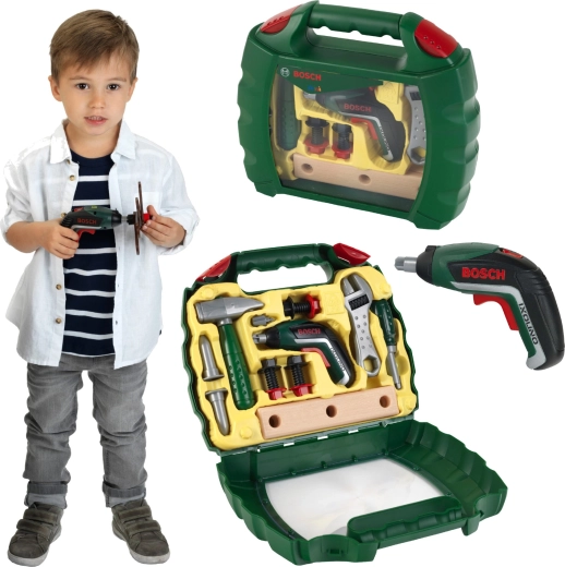 Стилен детски куфар с инструменти от лицензирана серия BOSCH Mini на марката Klein, който носи реалистична игра на малки майстори. Включва акумулаторен винтоверт Ixolino II на батерии с въртене надясно и наляво и звук на мотор, както и отвертка, френски ключ, чукче, болтове с гайки и „дървени“ пластини за тренировка по завинтване и заковаване. Здрав тъмнозелен куфар с прозрачен капак и два червени заключващи механизма държи всичко безопасно събрано.