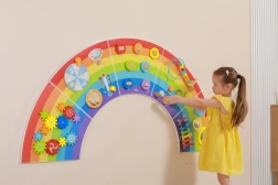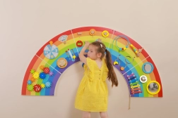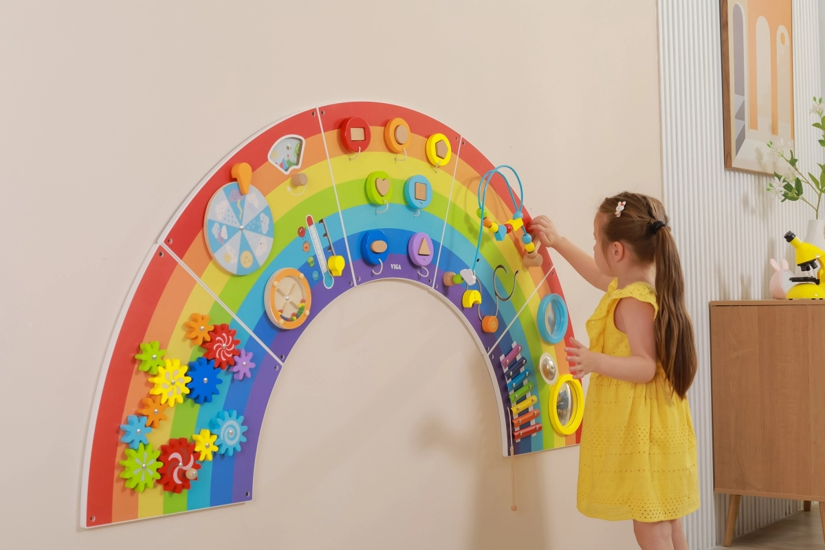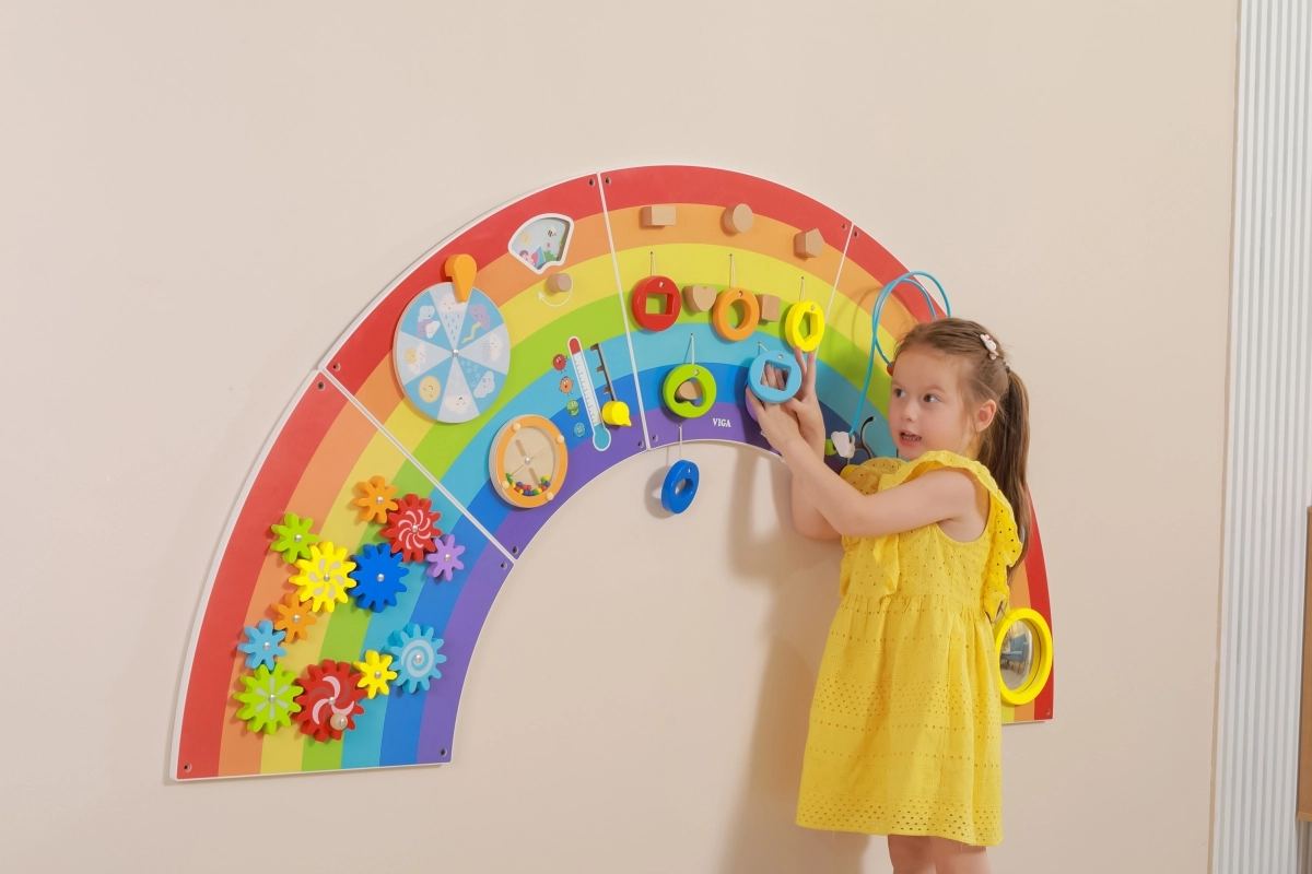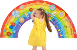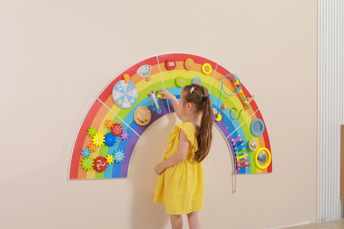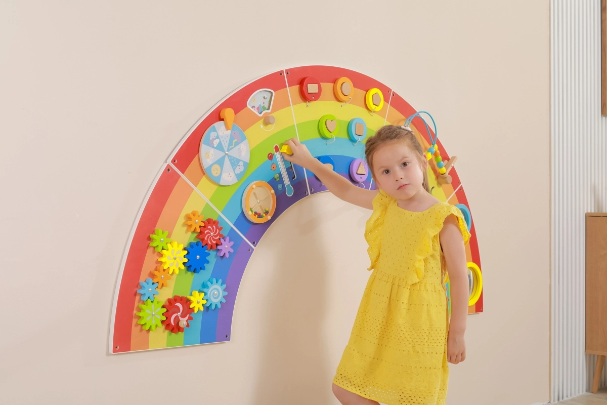 Дъговидната конструкция подпомага съвместната игра на деца с различен ръст и естествено учи цветове, форми, звуци и промени във времето. Всеки модул носи различен стимул за сетивно развитие, логическо мислене и търпение, докато стабилният стенен монтаж спестява място в игралната зона или класната стая.
