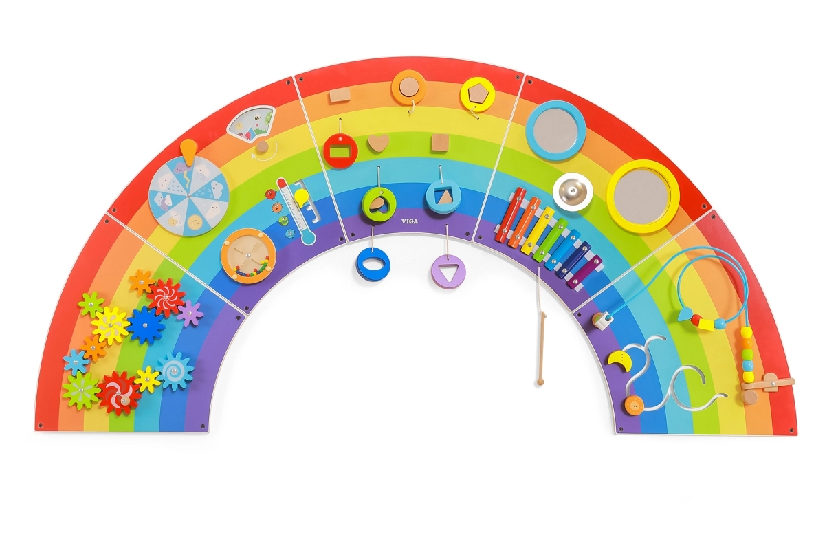 Дървената стенна дъска във формата на дъга от марката VIGA е многофункционална образователна играчка с 12 активности за сетивно изследване и фина моторика. Предлага зъбни колела, панел за времето, въртящ диск, сортер за форми, ксилофон, изпъкнало и вдлъбнато огледало, гонг и лабиринт с мъниста. Тя е разделена на 5 еднакви части за лесен транспорт и монтаж, изработена е от дърво с сертификат FSC и е боядисана с нетоксични бои.