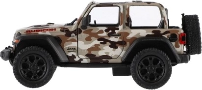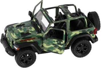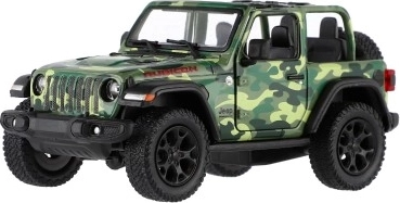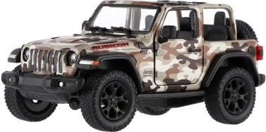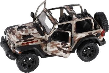 Метален модел на автомобила Jeep Wrangler, издание Camo с реалистични детайли, отварящи се врати и механизъм за издърпване назад, наличен в три цвята. Идеален за малки авантюристи и колекционери.