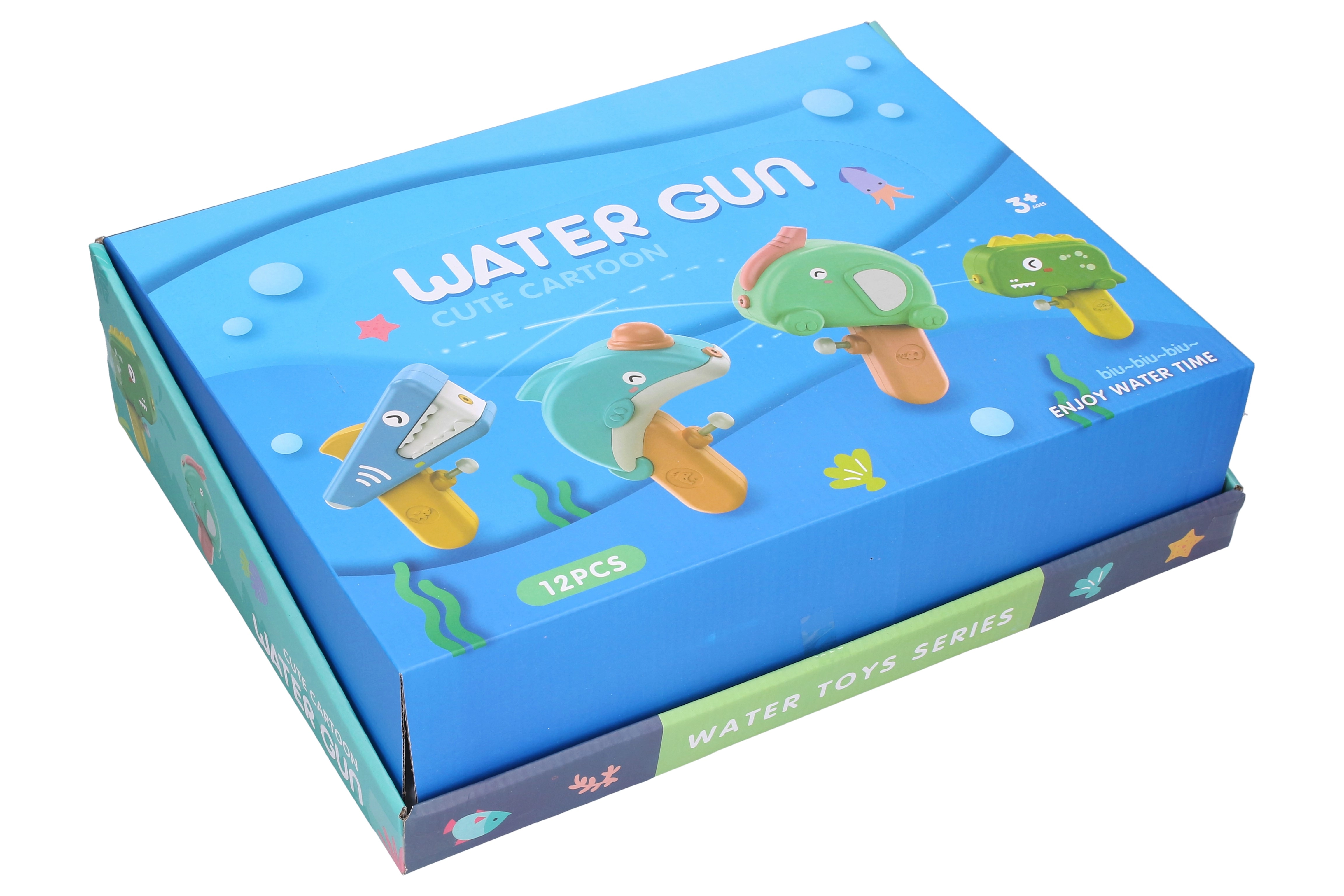 Водните пистолети се пълнят лесно с вода и пръскат плавно, така че са перфектни за игра край басейна, на плажа и в градината. Картонена кутия-дисплей съдържа 12 броя, което е практично решение за детски партита и кътове за игра.