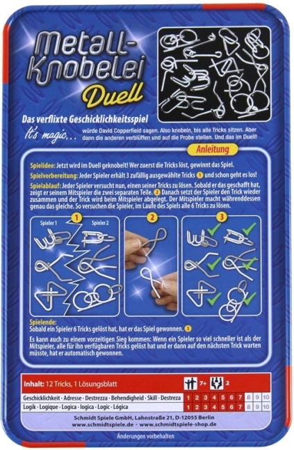Този комплект SCHMIDT Metall-Knobelei Duell предлага дванадесет умно проектирани метални пъзела в практична метална кутийка. Всеки елемент изпитва вашето търпение, логика и фината моторика: първо разделете двете части без сила, след това ги върнете в първоначалната форма. Благодарение на включеното илюстрирано ръководство можете по всяко време да надникнете за подсказка.